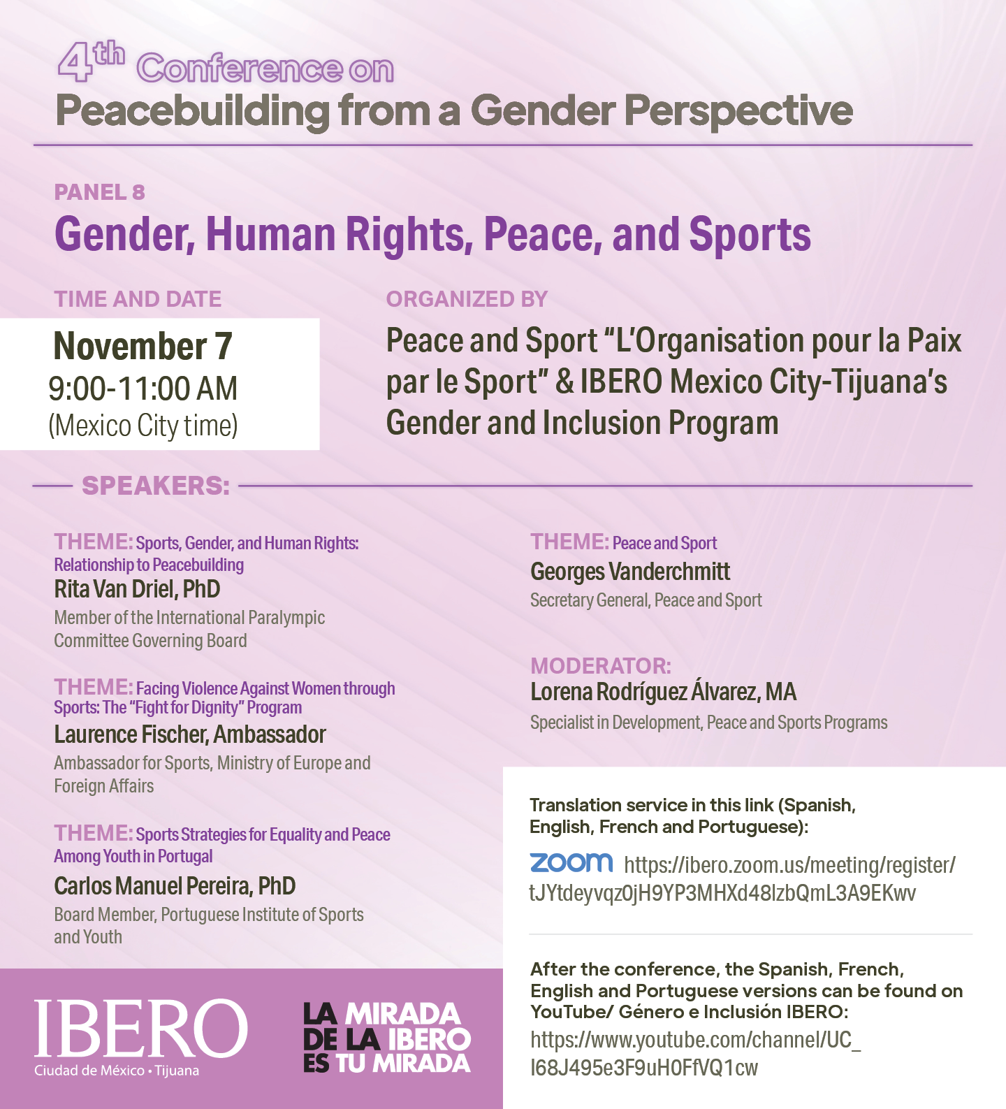 The 4th Conference on Peacebuilding from a Gender Perspective will take place from November 3 to 13. Peace and Sport has been honoured to participate in the organization of the 8th panel with the IBERO Mexico City-Tijuana’s Gender and Inclusion Program. We hope to collaborate again with IBERO in the future.