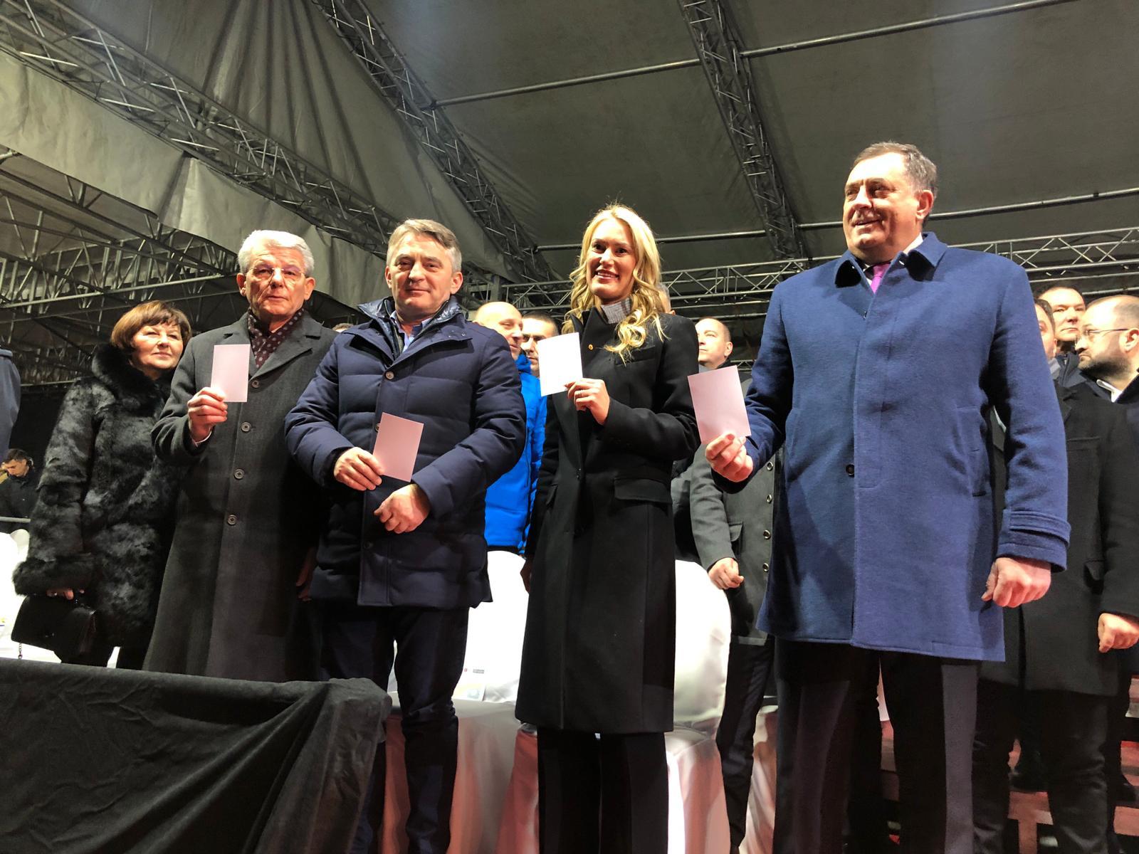 Champion for Peace Marlène Harnois surrounded by leaders of Bosnia Herzegovina tripartite Presidency Milorad Dodik, Željko Komšić and Šefik Džaferović.